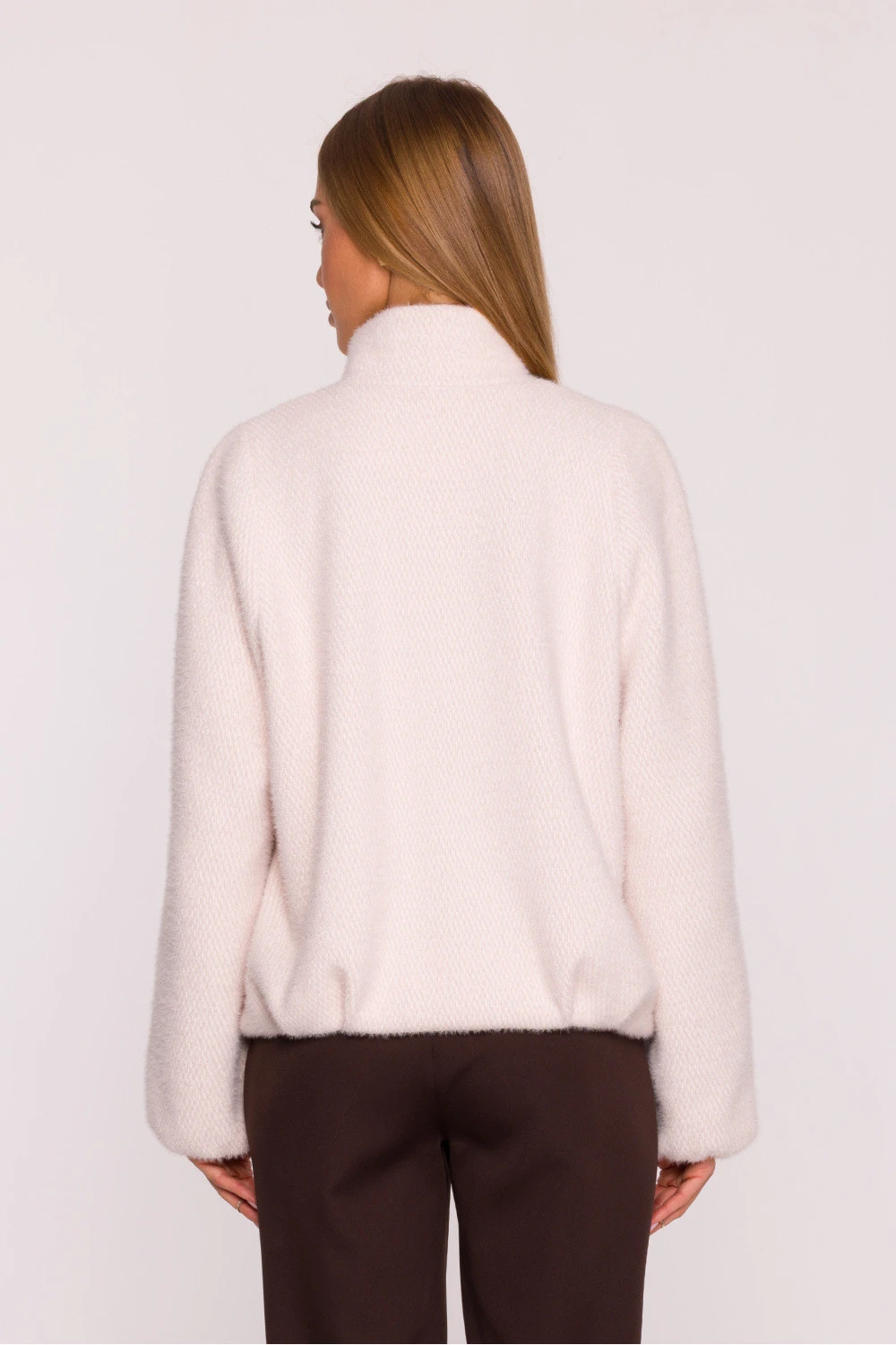 Elegantní dámská bunda vyrobená z měkké pleteniny s krátkým chlupem je návrh, který spojuje pohodlí a moderní charakter. Celý kousek je vybaven podšívkou, díky čemuž se bunda skvěle tvaruje a poskytuje pohodlí při nošení. Model je vybaven praktickým stojáčkem a zipem, doplněnými knoflíky umístěnými v dolní části plisované a na límci. Široké, dlouhé rukávy s reglanovým střihem dodávají siluetě lehkost a volnost, a boční kapsy s kapsami přidávají funkčnost. Bundu má volný, volný střih v lehce oversized stylu, jemně se přizpůsobující postavě. Její délka sahá až po linii boků, což jí skvěle ladí jak s džíny, tak s elegančnějšími stylizacemi. Navrženo a ušito v Polsku, představuje jedinečné spojení kvality, pohodlí a moderního designu.