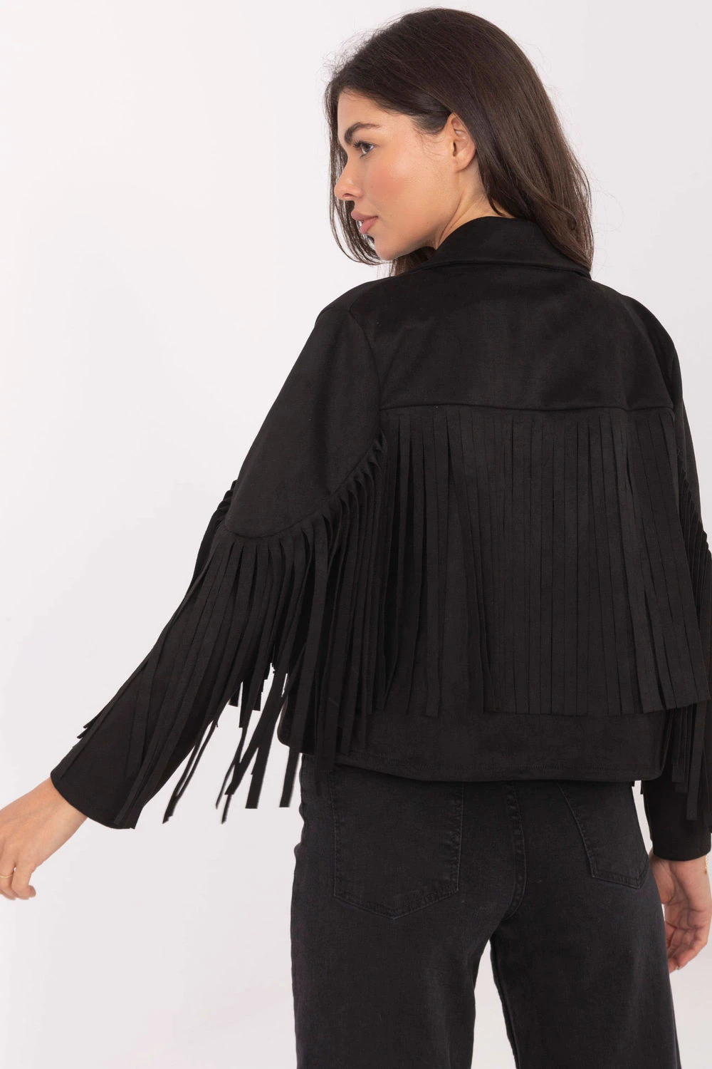 Dámská přechodná bunda s casual charakterem, ideální na podzim, zimu a jaro. Vyrobená z polyesteru a elastanu, okouzlující hladkou fakturou materiálu a pohodlným střihem, který skvěle padne do každodenních outfitů. Model standardní délky je vybaven klasickým límcem a klopmi, které dodávají celku nadčasový styl. Největší ozdobou bundy jsou rafie umístěné na rukávech, přední části a zádech, které dodávají originální, lehce boho charakter a vyzdvihují outfit. Lehká, bez podšívky a bez zapínání, je skvělým doplňkem každodenních outfitů, poskytující pohodlí a volnost pohybu, zároveň přitahující pozornost neobvyklým zpracováním.