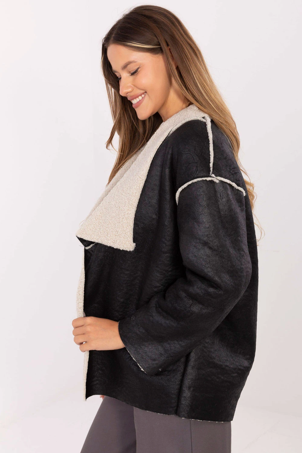 Casual dámská bunda s kožíškem je ideální volbou na podzim/zimu. Vyrobená z vysoce kvalitního polyesteru, je lehká a pohodlná, ale zároveň efektní. Model má standardní délku a dlouhé rukávy, a charakteristické klopy s kožíškem mu dodávají stylový vzhled. Bunda zůstává nezapnutá, co zdůrazňuje její volný, moderní střih. Udržovaný v hladkém vzoru, skvěle se hodí do každodenních outfitů jako módní přechodná bunda bez podšívky a výplně.