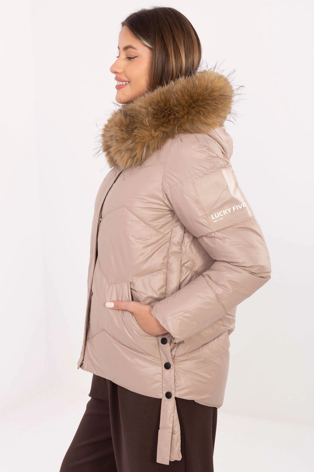 Tato dámska zateplená bunda je ideálnou kombináciou štýlu, funkčnosti a pohodlia, skvelá na chladné dni jesennej/zimnej sezóny. Vyrobená z odolného polyesteru, efektívne chráni pred vetrom a chladom, syntetické plnenie a zateplená podšívka zaisťujú teplo a pohodlie aj počas mrazivého počasia. Model s štandardnou dĺžkou a prešívaným dokončením vyzerá moderno a žensky. Kapucňa s odnímateľným kožúškom je praktickým detailom, ktorý umožňuje prispôsobiť vzhľad bundy na príležitosť, v verzii s kožúškom získava viac útulný a elegantný charakter, a bez neho pôsobí ľahko a športovo. Bunda má zips a suchý zips, čo zaručuje dodatočnú ochranu pred zimou, a vložené vrecká sú zároveň funkčné aj štýlové. Je to ideálna voľba pre každodenné štýly a do práce, kombinujúca pohodlie s nadčasovou estetikou.