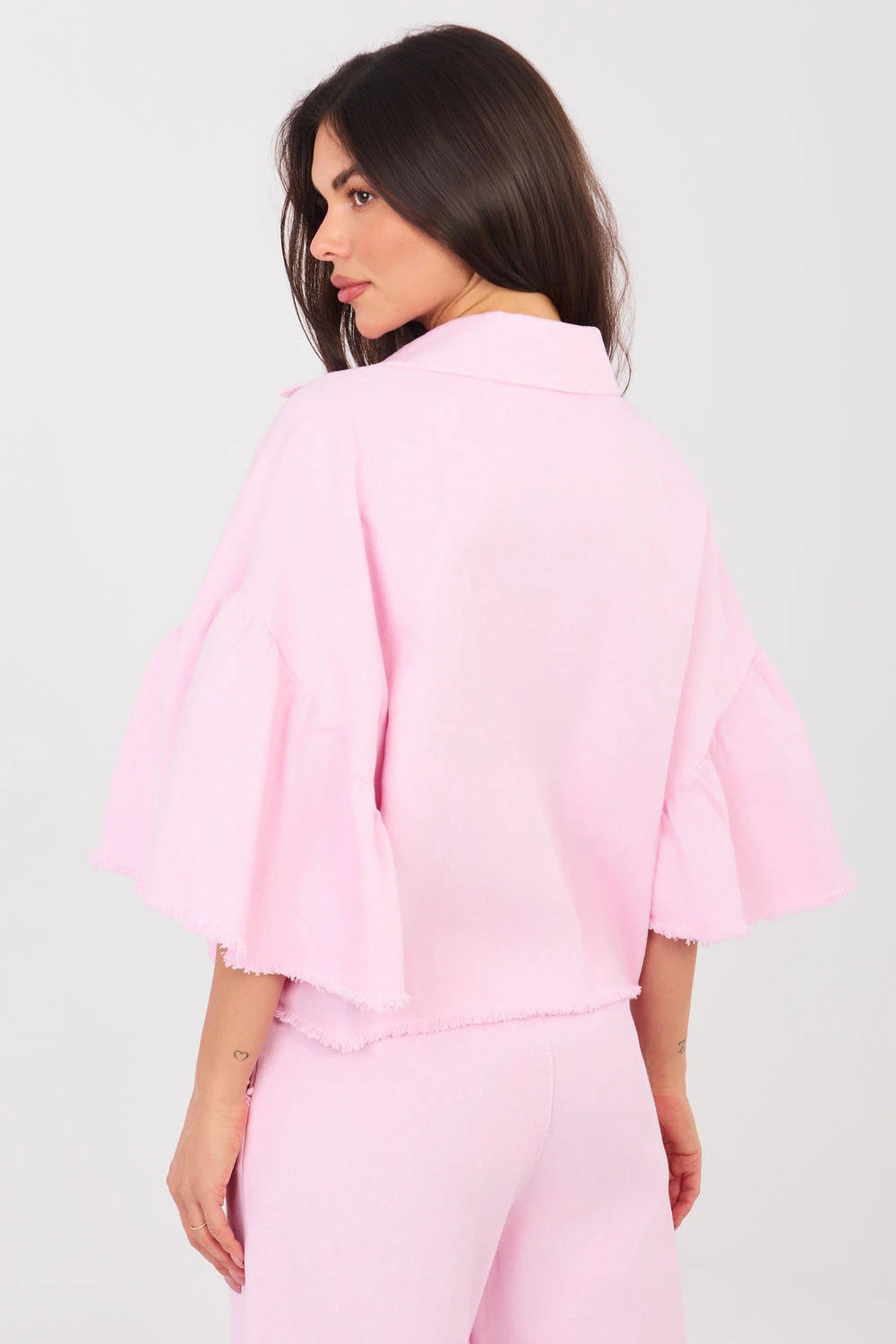 Stylová dámská džínová bunda v casual stylu, ideální na jaro a léto. Vyrobená z vysoce kvalitní bavlny, poskytuje pohodlí při nošení každý den. Krátký střih krásně zdůrazňuje postavu, a spodní část a rukávy s moderním řezáním přidávají celku lehkost a charakter. Model se zapíná na knoflíky, vpředu má praktické nášivky. 3/4 rukávy s volánem přinášejí jemný, ženský akcent, který skvěle prolomuje klasický džínový styl. Bundu nemá podšívku, což se skvěle hodí na teplejší dny. Univerzální návrh pro každodenní styling, ideální jak k šatům, tak k džínám nebo sukním.