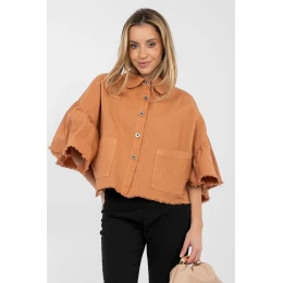 Elegantní dámská džínová bunda v casual stylu, ideální na jaro a léto. Vyrobená z vysoce kvalitní bavlny, poskytuje pohodlí při nošení každý den. Krátký střih krásně zdůrazňuje postavu, a spod a rukávy s moderním sfouknutím dodávají celku lehkost a charakter. Model se zapíná na knoflíky, vpředu má praktické nasazené kapsy. 3/4 rukávy s volánem přinášejí jemný ženský akcent, který skvěle prolomuje klasický džínový styl. Bundu není podšitá, což ji skvěle hodí na teplejší dny. Univerzální nabídka pro každodenní stylizace, ideální jak k šatům, tak k džínám nebo sukním.