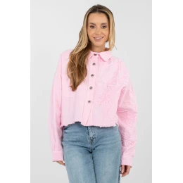 Elegantní dámská džínová bunda v casual stylu, ideální na každý den. Vyrobená z vysoce kvalitní bavlny, poskytuje pohodlí a univerzální charakter. Model s krátkou délkou s klasickým límcem a dlouhým rukávem, zapínání na knoflíky. Spod bundy je zakončen moderním roztržením, které dodává celku lehce rockový akcent. Originalitu dodávají vyšívané květiny umístěné na levé straně bundy vpředu, na rukávu a na zádech, vytvářející efektní a ženský detail. Praktická kapsa na pravé straně na úrovni hrudníku zdůrazňuje užitkový charakter modelu. Skvělá volba pro každodenní outfit, jak s šaty, tak s džínami nebo sukní.