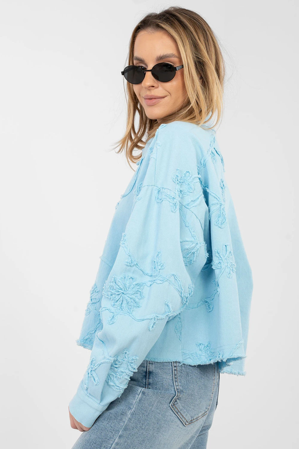 Elegantní džínová bunda pro ženy v casual stylu, ideální na každý den. Vyrobená z vysoce kvalitní bavlny, poskytuje pohodlí a univerzální charakter. Model s krátkou délkou, klasickým límcem a dlouhým rukávem, zapínací na knoflíky. Spod bundy je zdobený moderním postranním roztržením, které dodává celkovému vzhledu lehce rockový nádech. Originálnost přidávají vyšívané květiny umístěné na levé straně bundy vpředu, na rukávu a na zádech, vytvářející efektní a ženský detail. Praktická kapsa na pravé straně na hrudi zdůrazňuje užitný charakter modelu. Skvělá volba pro každodenní outfit, ať už s šaty, džínami nebo sukní.