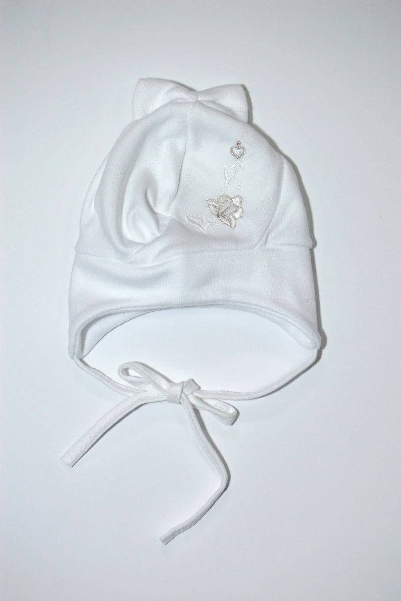 Dívčí čepice s ozdobnou mašlí a výšivkou.