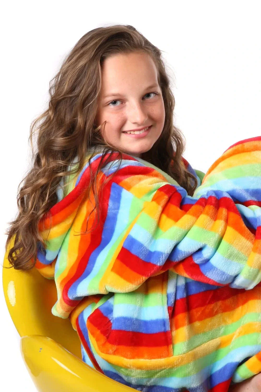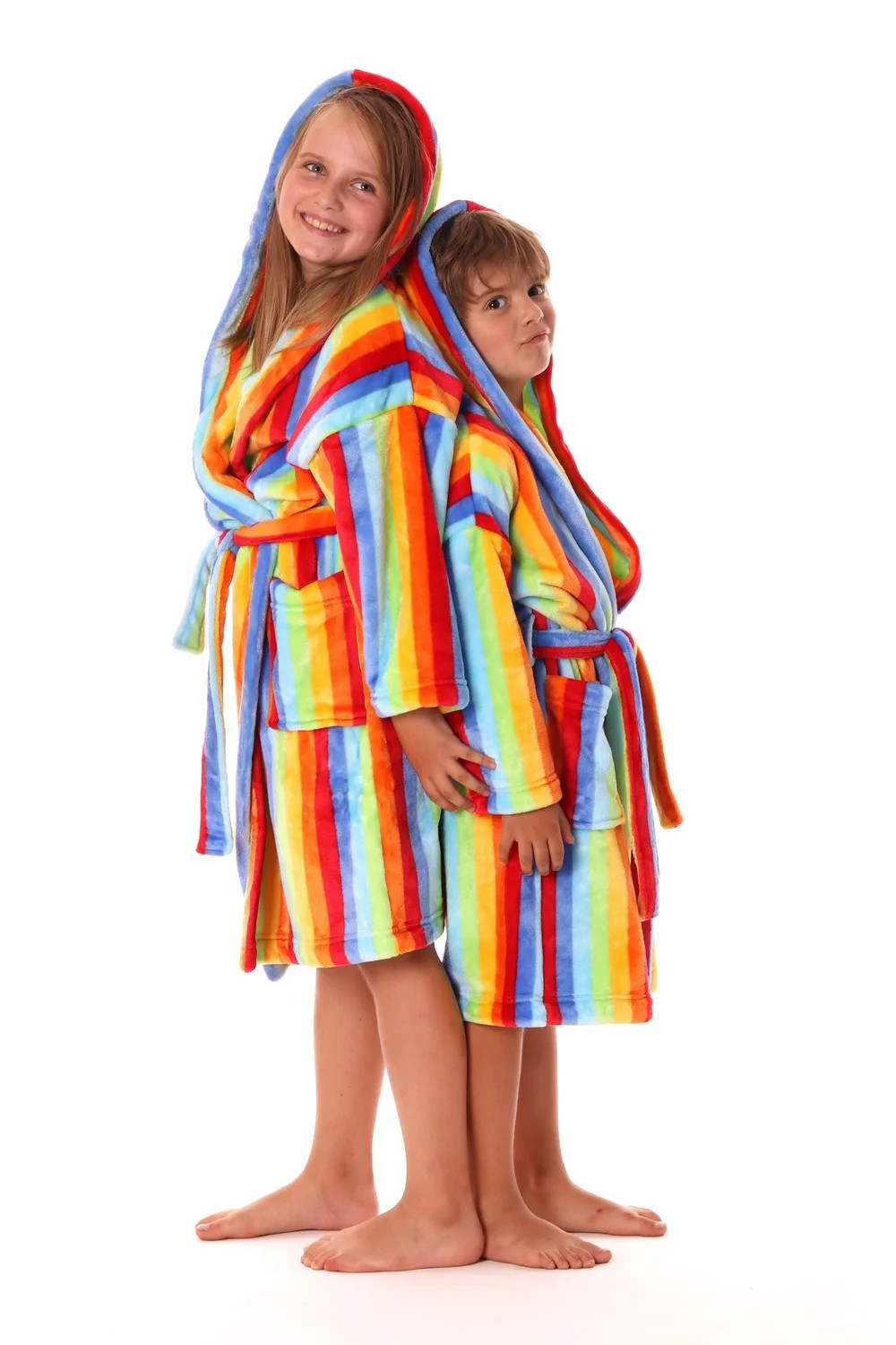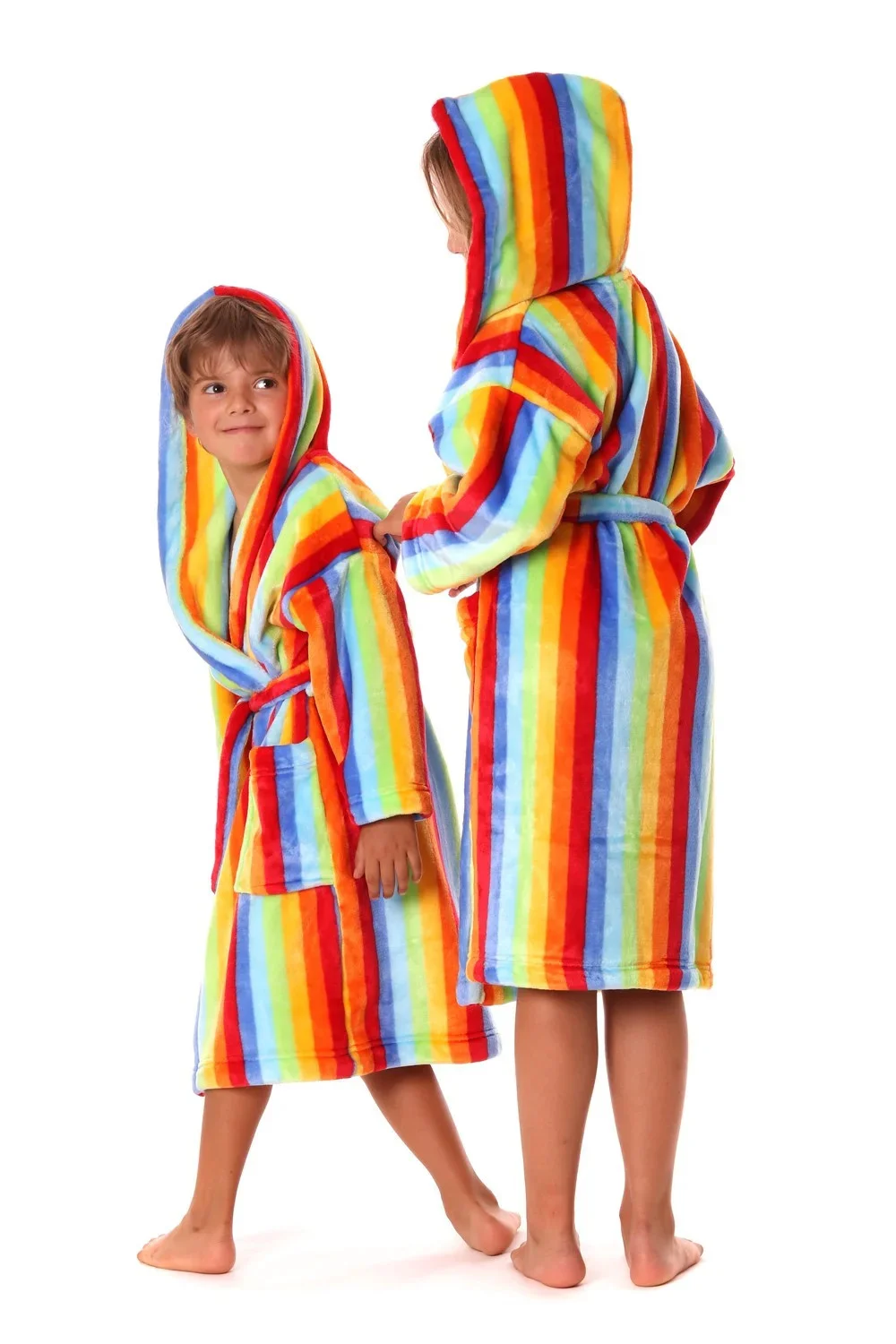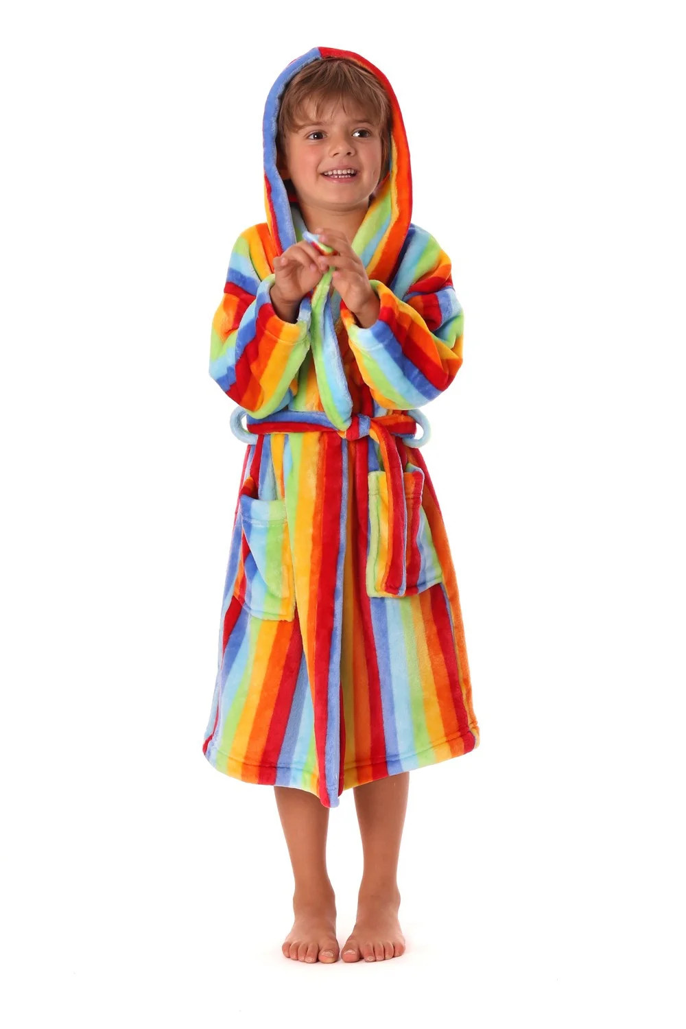 Tento veselý župan s kapucí v jasných duhových barvách je tím pravým parťákem pro chladné večery a studená rána.