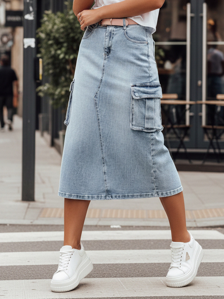 Džínová midi sukně v módním cargo střihu, ideální pro milovníky ležérního stylu. Vyznačuje se velkými ozdobnými bočními kapsami a jemným prošíváním, které jí dodávají originální charakter. Vysoký střih zvýrazňuje siluetu a opticky prodlužuje nohy, zatímco jemný rozparek v zadní části zajišťuje pohodlí při nošení. Ideální pro každodenní nošení, hodí se k teniskám i elegantním botám.