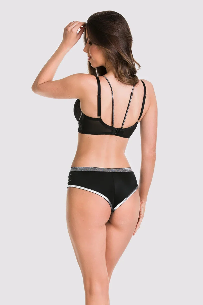 Měkká podprsenka, košíčky z lehkého tylu pokrytého jemnou krajkou, horní část zakončená černým lemováním, bez bočního kosticování, mašlička košíčků je zdobená stříbrným páskem a výstřih a záda zdobí délkově nastavitelná ramínka.
