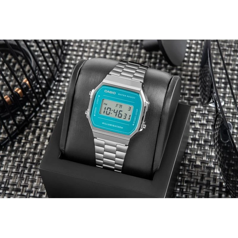 Nie każdy zegarek potrafi połączyć klasykę z charakterem, ale ten robi to bez wysiłku. Casio A168WEM-2EF to powrót do korzeni w najlepszym wydaniu – prosty, czytelny, z lustrzaną tarczą w turkusowym odcieniu, która przyciąga spojrzenia, ale nie robi z tego show. Chromowana koperta i dopasowana stalowa bransoleta tworzą spójną całość – surową, elegancką, bez przesady. Ten zegarek nie potrzebuje trendów. On już dawno wyznaczył własne. Model posiadastandardowe wskazanie czasu (cyfrowe): godzina, minuta, sekunda, oznaczenie pory dnia (PM), data, dzień tygodnia. A gdy przychodzi moment działania – ma wszystko, czego trzeba. Stoper 1/100 sekundy, funkcja międzyczasów, codzienny alarm i sygnał godzinowy – praktyczne narzędzia w zgrabnym wydaniu. Wieczorem, gdy światło przygasa, wystarczy jedno naciśnięcie–elektroluminescencyjne podświetlenie w odcieniu niebieskozielonym rozjaśni tarczę i nada jej niepowtarzalnego klimatu. Model posiada również odporność na zachlapa