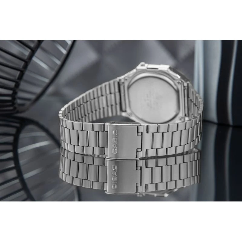 Náramek je vyroben z vysoce kvalitní nerezové oceli, která zajišťuje odolnost a celodenní pohodlí, a jeho klasický design dokonale ladí s vintage atmosférou, zatímco jemná kartáčovaná povrchová úprava dodává hodinkám nadčasový vzhled. Logo Casio na sponě.
