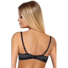 Biustonosz marki PariPari. Model Catherine III. Posiada druty, które podpierają piersi odpowiednio je kształtując. Fiszbiny pionowe osadzone na bokach. Produkt posiada regulowane ramiączka bez możliwości ich odpięcia. Haczyki do ramiączek metalowe. Biustonosz zapinany na haftki. Miejsce zapięcia: tył. Produkt został wykonany z 78% poliamid, 17% elastan, 5% bawełna. Produkt posiada kieszonki na wkładki. Produkt damski.