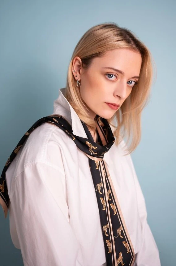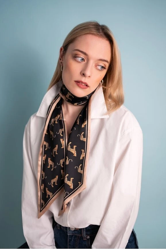 - úzký tvar šály umožňuje mnoho způsobů nošení: uvázaná kolem krku, jako čelenka, jako doplněk kabelky