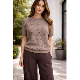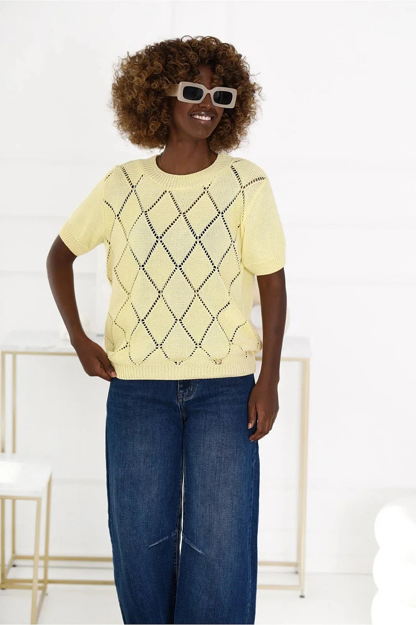 Stylový prolamovaný svetr klasického rovného střihu je vynikající volbou pro ženy, které si cení pohodlí a nadčasové elegance. Model s krátkými rukávy a kulatým výstřihem je ideální pro každodenní styling, poskytuje volnost pohybu a všestrannost. Jemný prolamovaný vzor na přední straně dodává celku moderní vzhled, díky němuž lze svetr snadno sladit s ležérními i elegantnějšími komplety. Svetr je vyroben z kvalitní směsi bavlny (50 %) a akrylu (50 %), je měkký, příjemný na dotek a dobře sedí na siluetě. Materiál je trvanlivý, odolný vůči každodennímu nošení a snadno se udržuje, což z něj činí praktickou volbu pro každou příležitost.