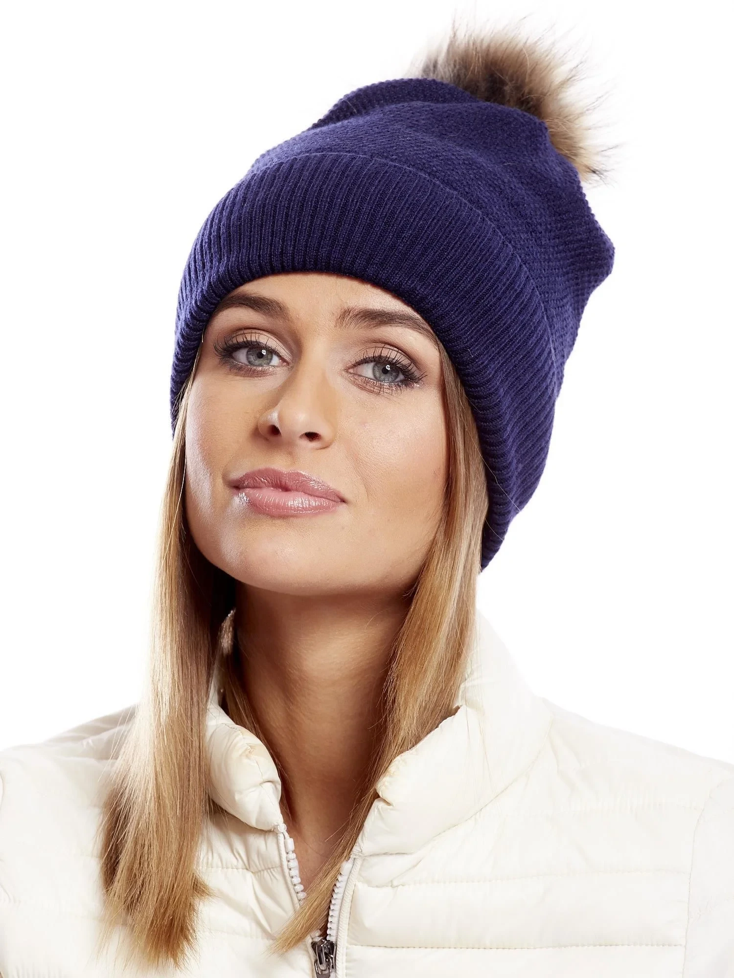 Čepice s chlupatou bambulí tmavě modrá