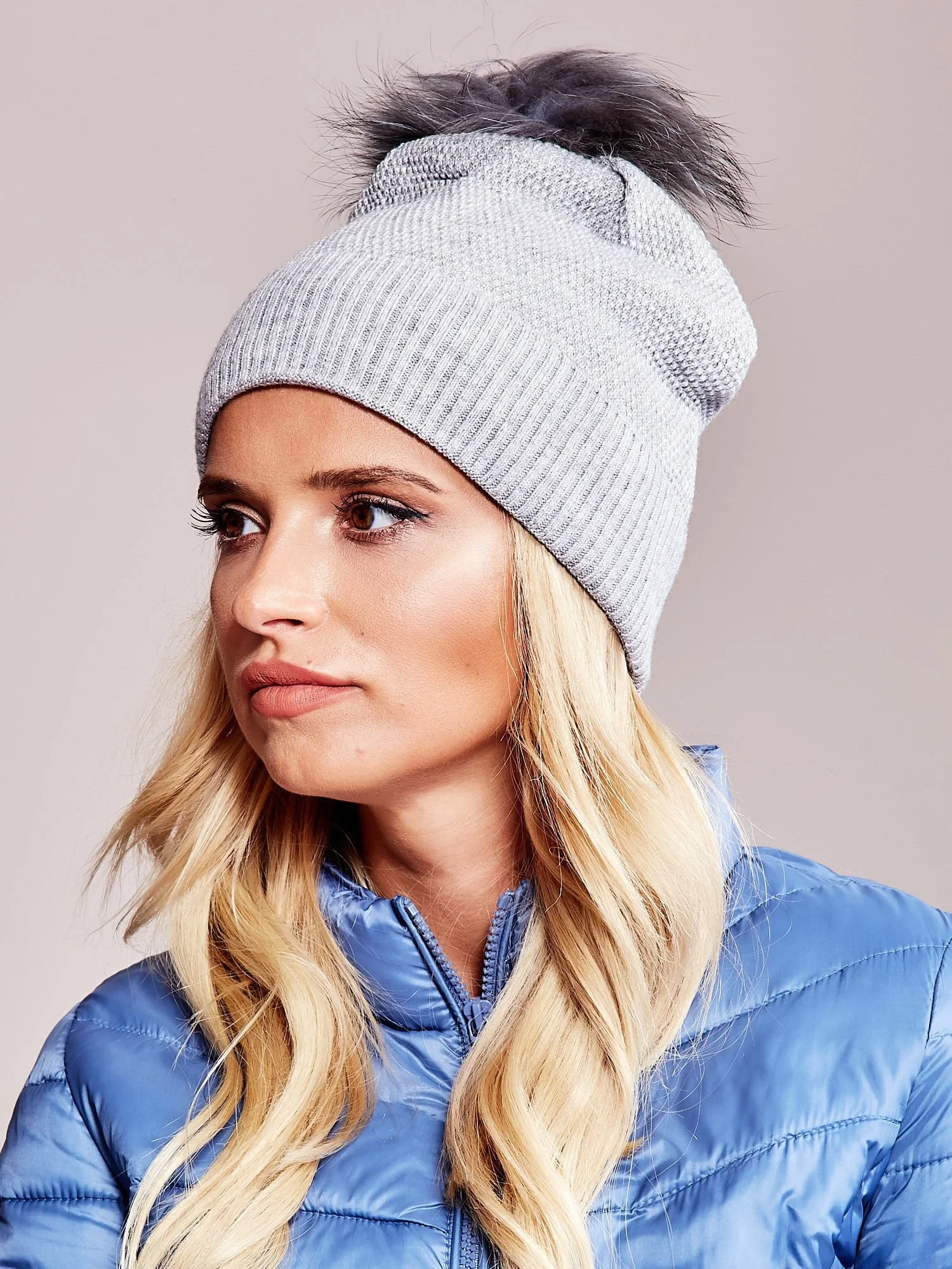 Čepice s chlupatou bambulí šedá