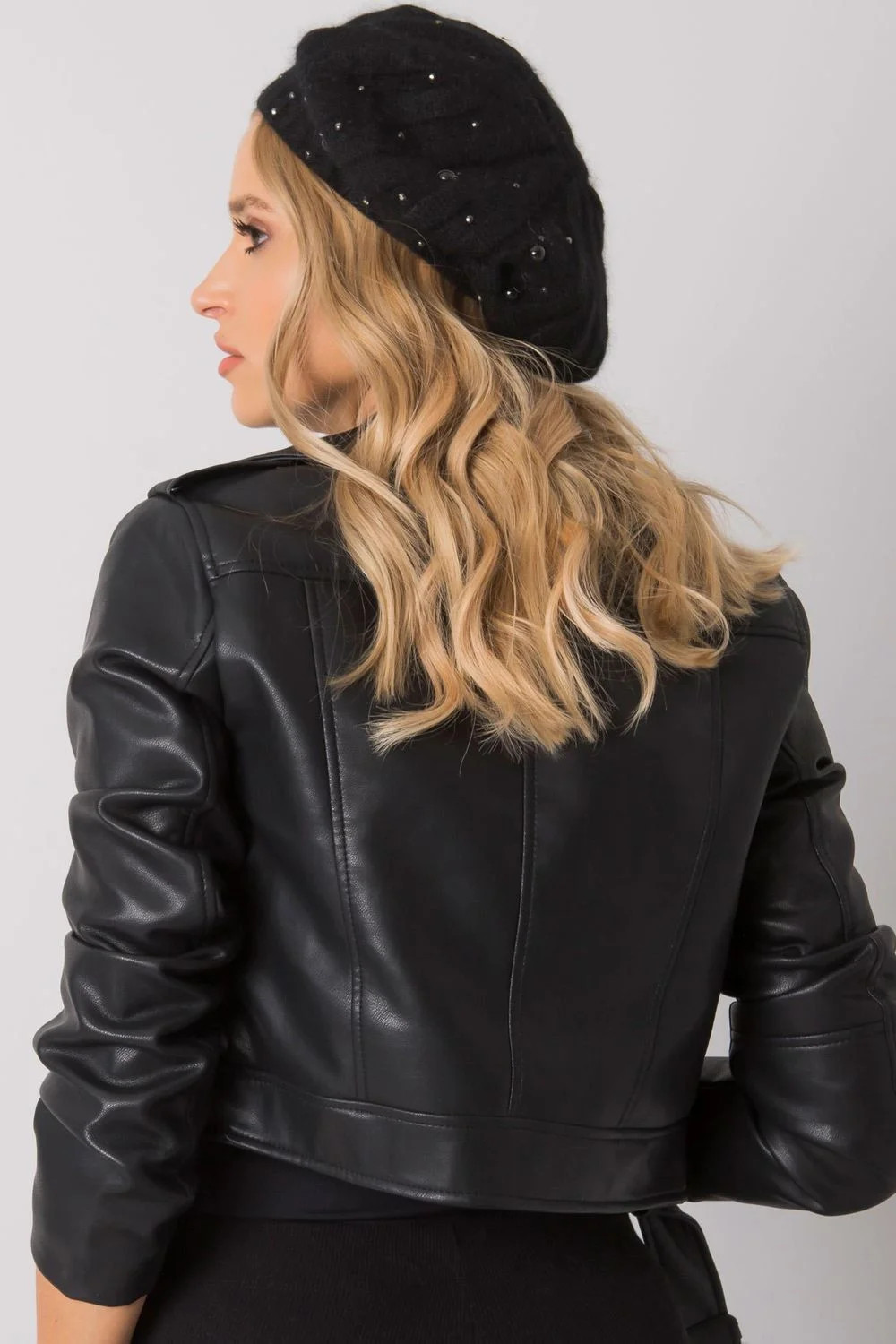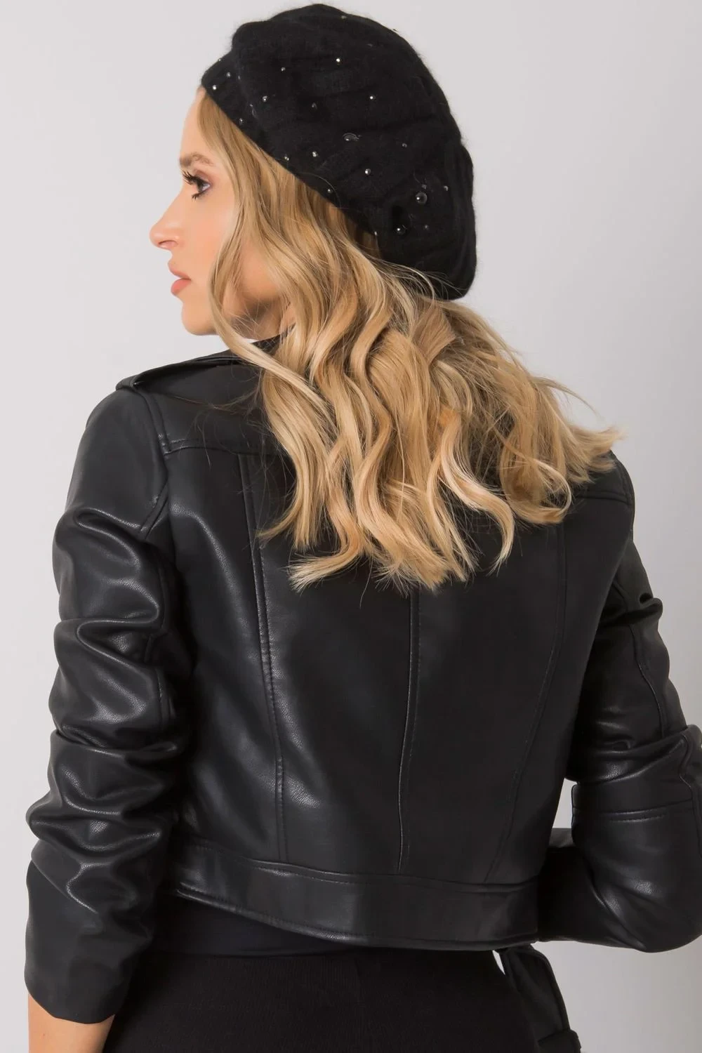 Dámská čepice v černé barvě zdobená kamínky a perlami.