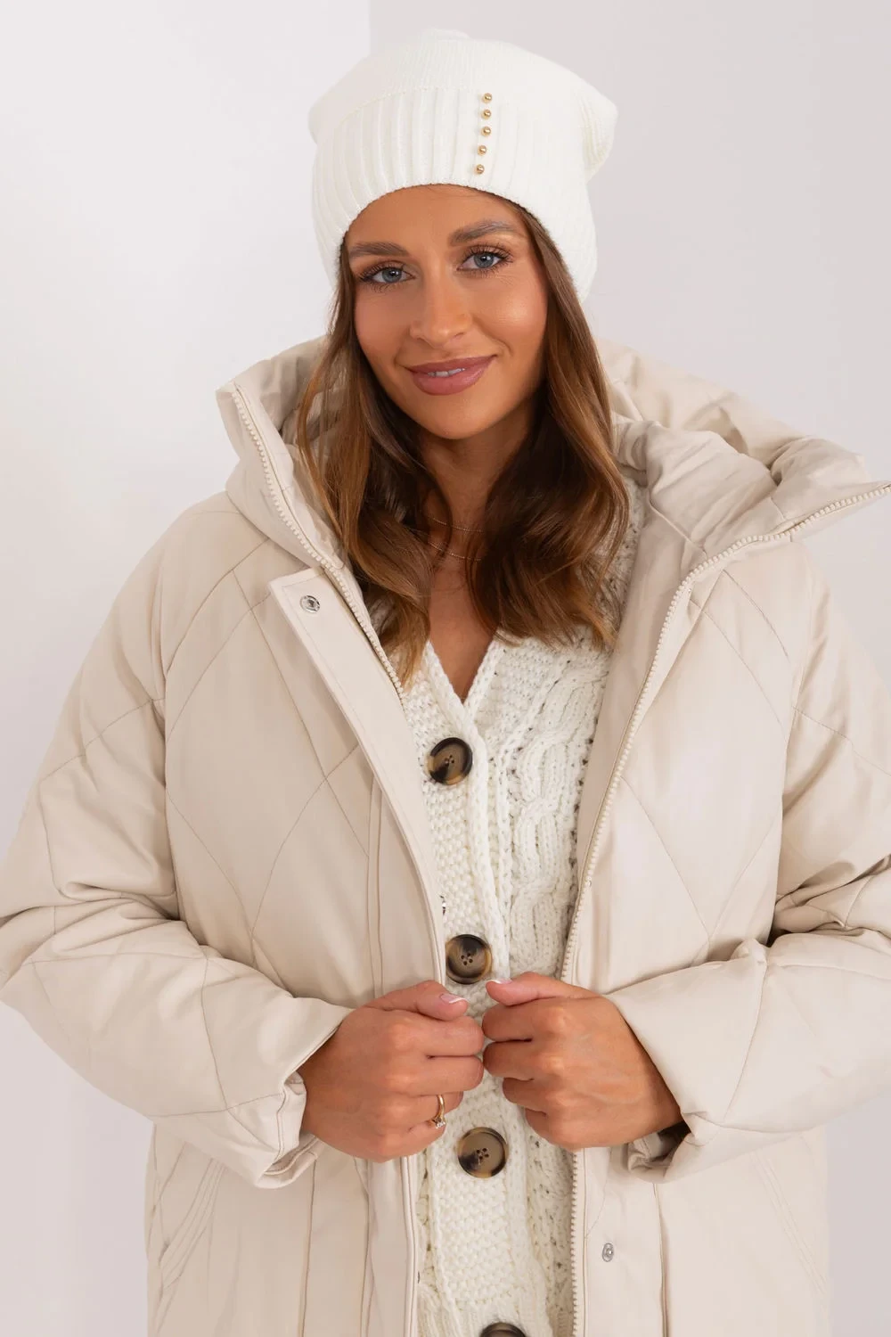 Dámská zimní čepice s hladkou texturou a ozdobnými perlami.