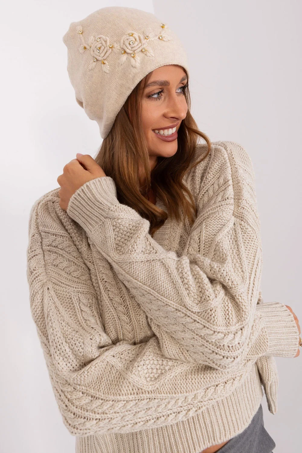 Hřejivá dámská zimní čepice z hladkého úpletu s ozdobnou aplikací na boku.