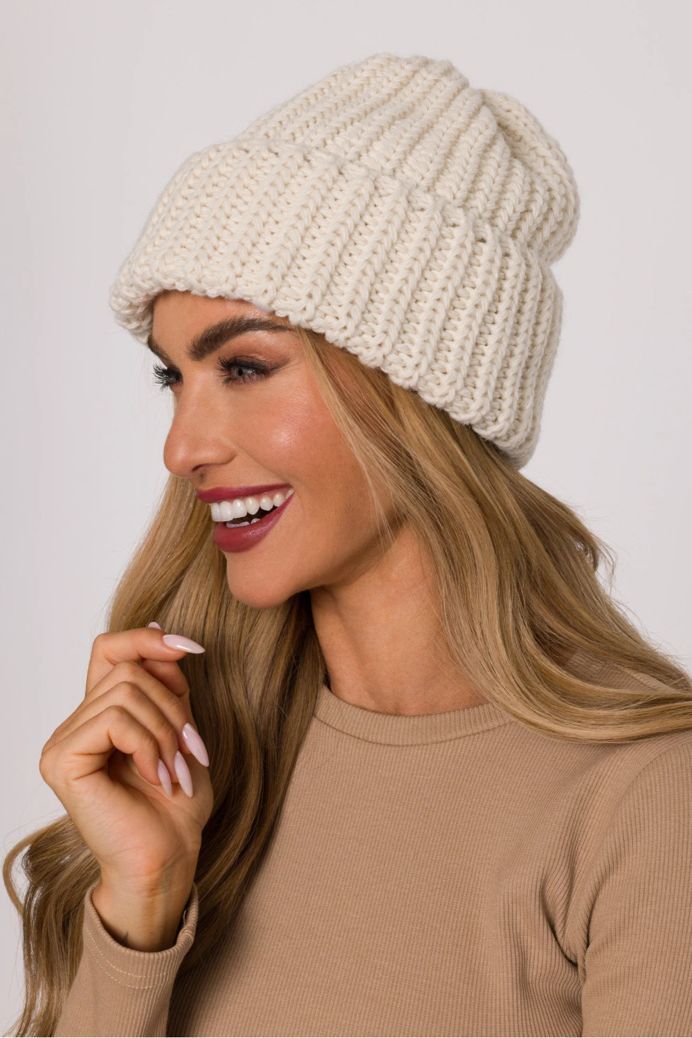 Teplá čepice vyrobena z měkké příze s hrubým, pruhovaným vzorem. Má jednoduchý střih s trochou volnosti v horní části, co jí dodává volný, moderní vzhled. Ohrnutý lem zajistí lepší přizpůsobení a dodatečnou vrstvu tepla, vytvářející ideální spojení stylu a pohodlí.