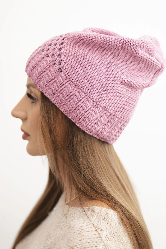Stylová dámská čepice vytvořená s ohledem na ženy, které si cení spojení elegance a funkčnosti v zimních doplňcích. Vyrobena z kvalitní směsi vlny a akrylu, zaručuje teplo i v chladných, mrazivých dnech. Jemný, ozdobný pletený vzor a lesklé kamínky vpředu jí dodávají ženský charakter a jemný lesk.