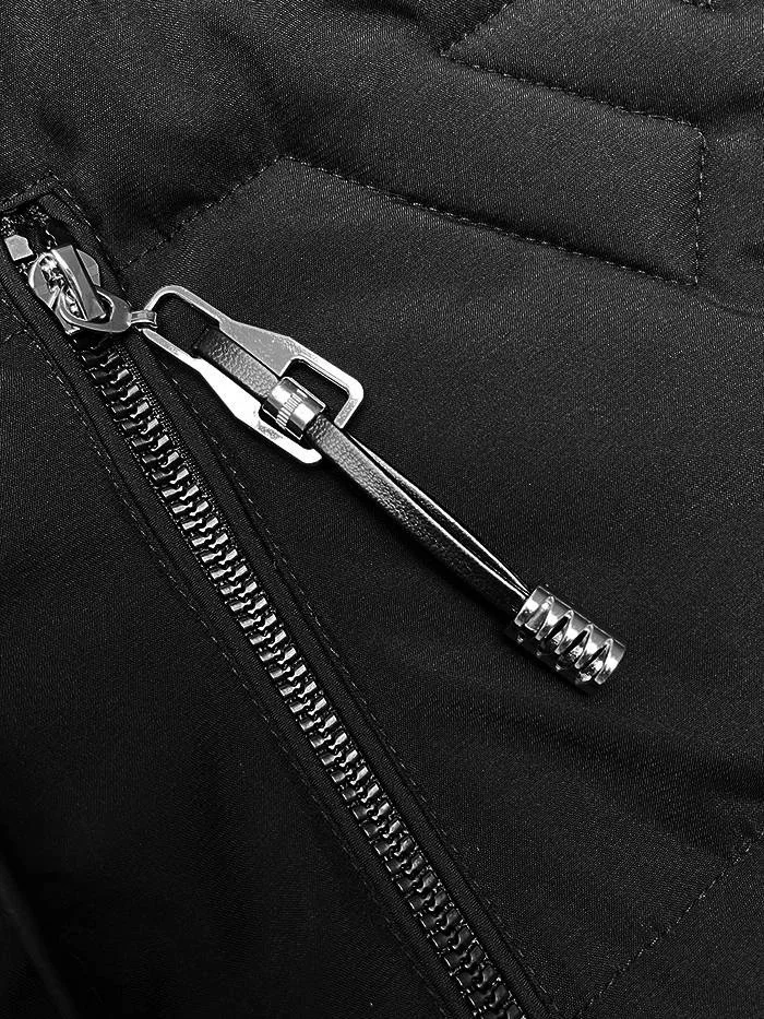 Vesta je zateplená syntetickou péřovou výplní, má dvě kapsy a zapíná se dvousměrným zipem. Model má kapuci, kterou je možné odepnout. Vesta má délku do poloviny stehen.