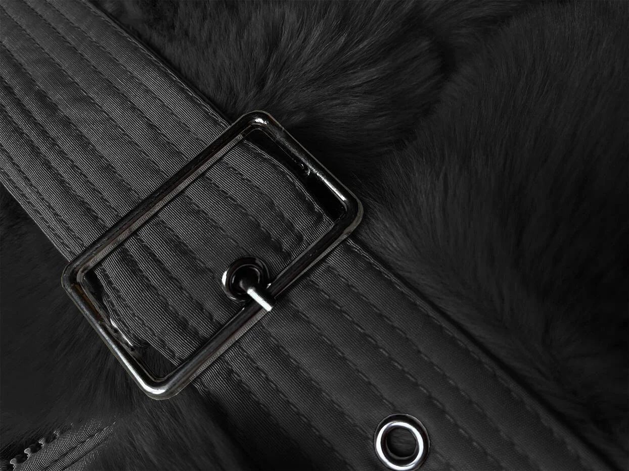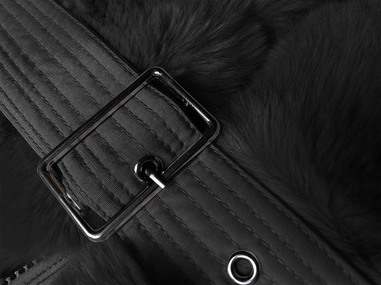 Bunda je lehce vypasovaná, je zateplená syntetickou péřovou výplní a na zádech má kožešinovou podšívku. Model má opasek, dvě kapsy a zapíná se zipem. Bunda má kapuci, kterou není možné odepnout. Kolem kapuce a podél zipu se táhne kožešina, kterou je možné odepnout. Na koncích rukávů jsou skryté stahovací lemy. Model má délku do poloviny stehen.