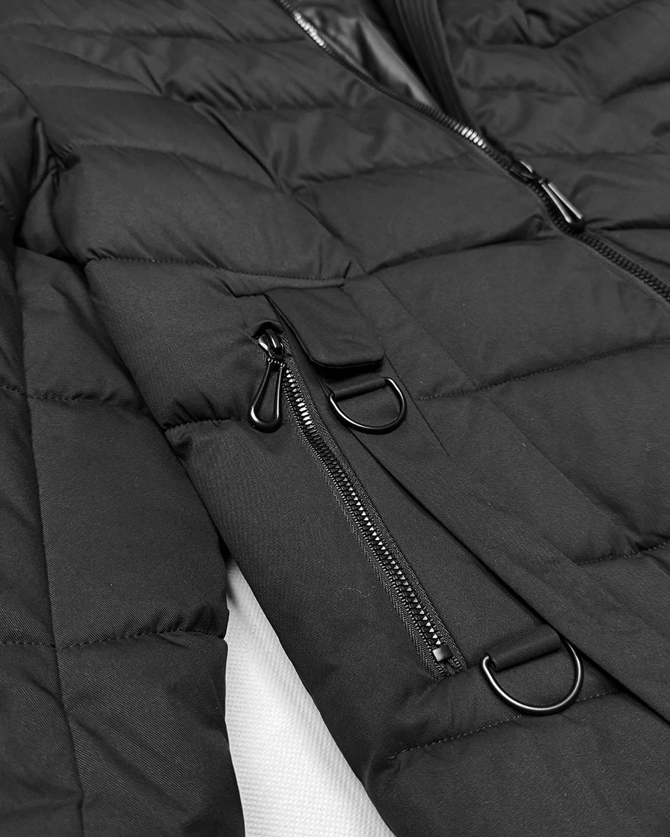 Bunda je zateplená syntetickou péřovou výplní, má dvě kapsy a zapíná se dvousměrným zipem. Model má kapuci olemovanou kožešinou. Zatímco kapuci není možné odepnout, kožešinu odepnout lze. Na koncích rukávů jsou skryté stahovací lemy. Bunda má délku ke kolenům.