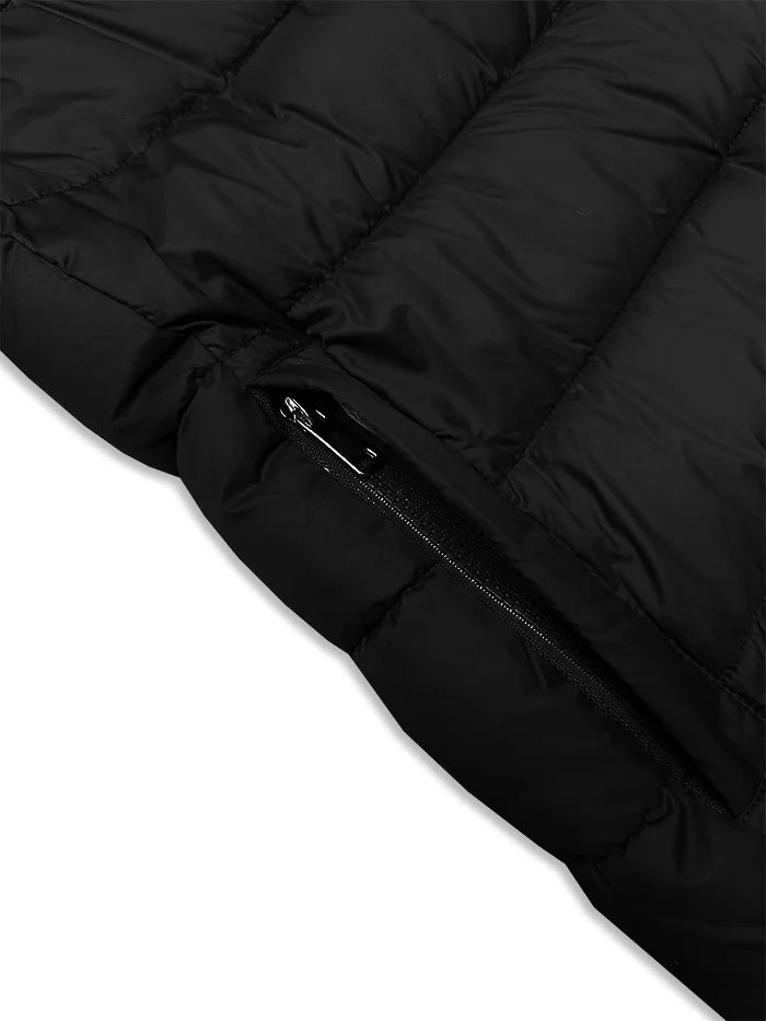 Bunda má volný střih, je zateplená syntetickou péřovou výplní, má pásek pro zavazování, dvě kapsy se zapínáním na zip a zapíná se dvousměrným zipem a panelem s patentkami. Model má kapuci, kterou není možné odepnout. Na koncích rukávů jsou skryté stahovací lemy.