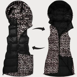 Černá hrubší oboustranná vesta s panteřím vzorem a s odepínací kapucí (T5-2602#-1)