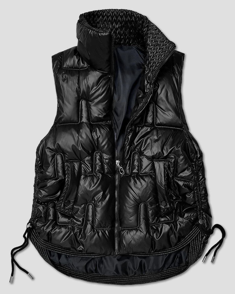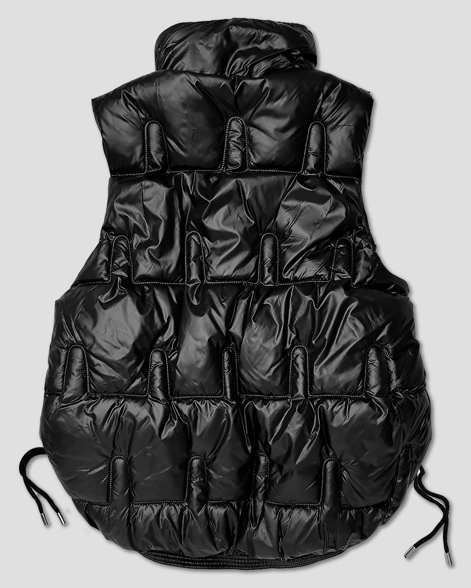 Vesta je zateplená syntetickou péřovou výplní, má dvě kapsy bez zapínání a zapíná se zipem. Model má délku k bokům.
