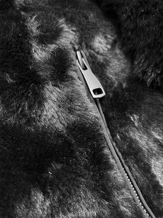 Bunda má jednoduchý střih, je zateplená syntetickou péřovou výplní, má dvě kapsy a zapíná se dvousměrným zipem. Model má kapuci, kterou není možné odepnout. Kolem kapuce a podél zipu se táhne kožešinový panel, který je možné odepnout. Na koncích rukávů jsou kožešiny, které je možné odepnout. V pase modelu je stahující šňůrka. Bunda má délku pod boky.