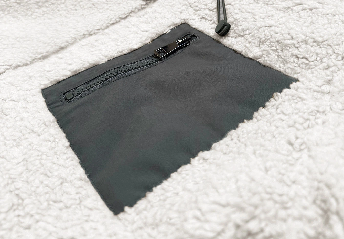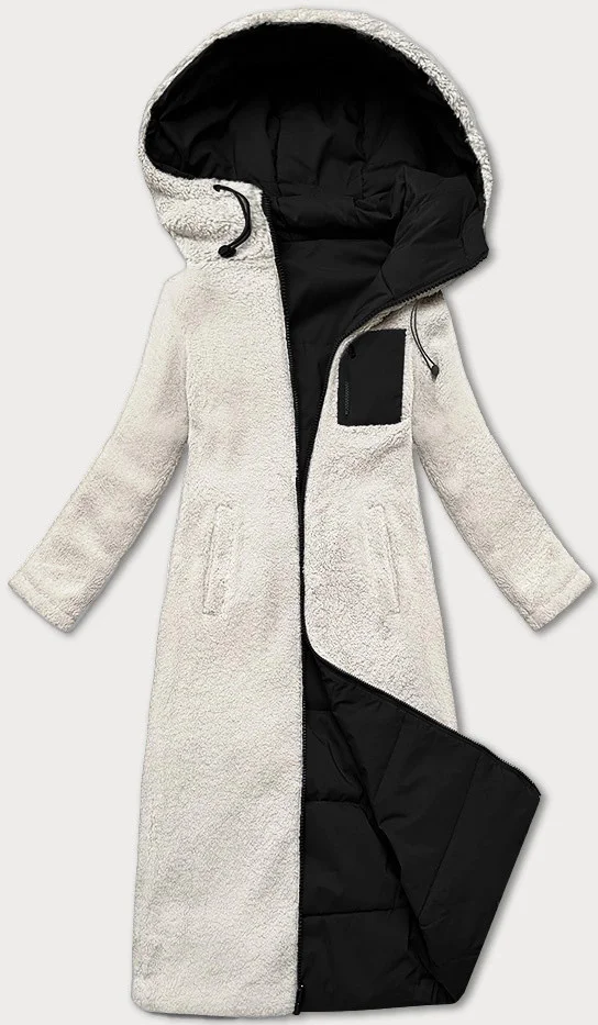 Jedna strana bundy je prošívaná a druhá je typu "beránek". Bunda je lehce vypasovaná, je zateplená syntetickou péřovou výplní, má dvě kapsy a zapíná se dvousměrným zipem. Model má kapuci, kterou není možné odepnout. Bunda má délku do poloviny lýtek.