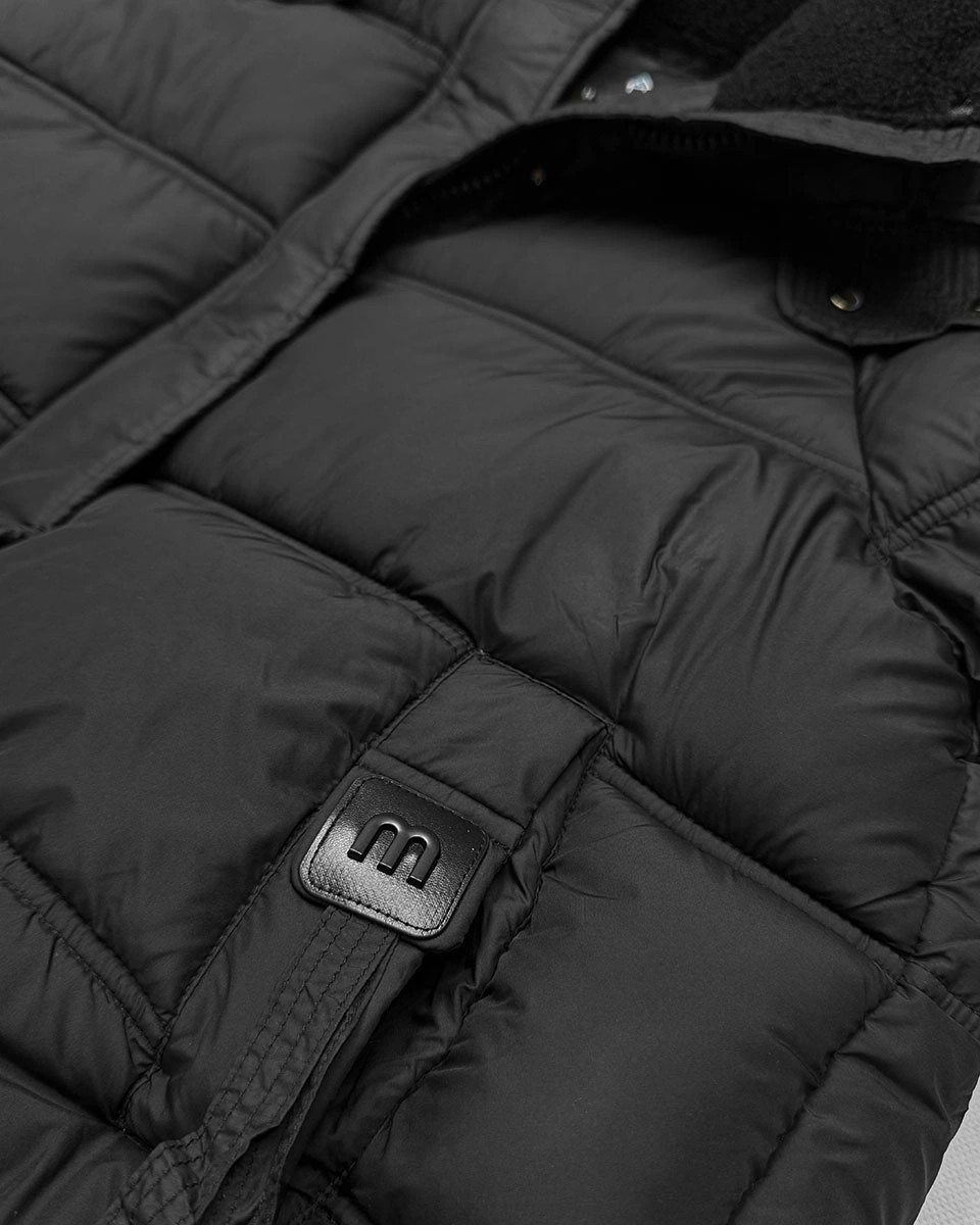 Bunda má jednoduchý střih, je zateplená vrstvou syntetické péřové výplně, má dvě kapsy bez zapínání a zapíná se zipem a panelem s patentkami. Model má kapuci, kterou není možné odepnout a má také kožešinový límec. Na spodním okraji modelu jsou stahující gumy. Bunda má délku k bokům.