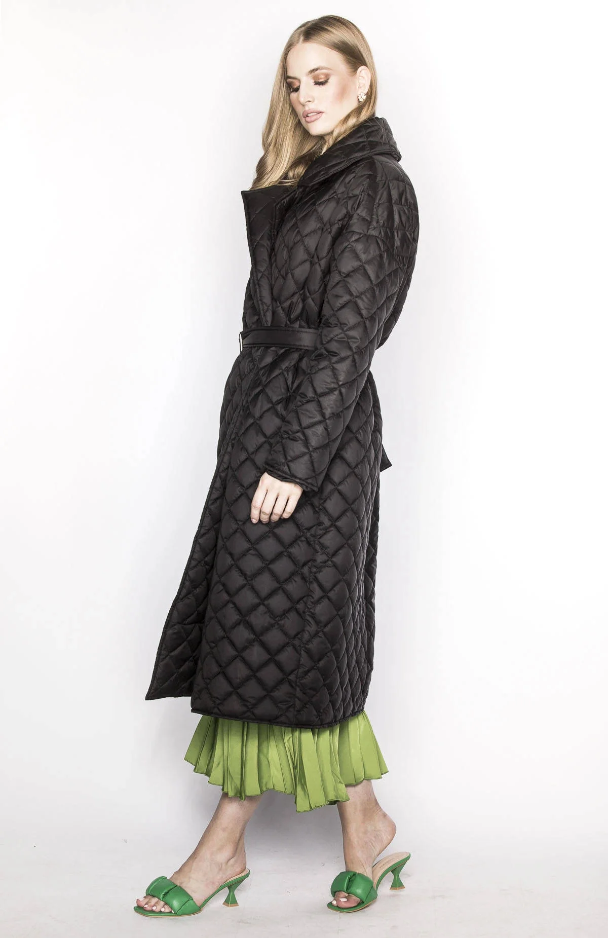 Bunda má jednoduchý střih, je lehce zateplená syntetickou péřovou výplní a má dvě kapsy. Model má límec. Bunda má délku ke kolenům a v pase má opasek s přezkou.