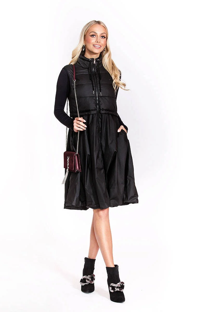 Vesta je lehce zateplená syntetickou péřovou výplní a má délku nad kolena. Model má stojáček, dvě kapsy a zapíná se dvousměrným zipem. V pase modelu jsou stahující gumičky. Vrchní část vesty je vypasovaná a spodní část je ušitá ze vzdušného materiálu.