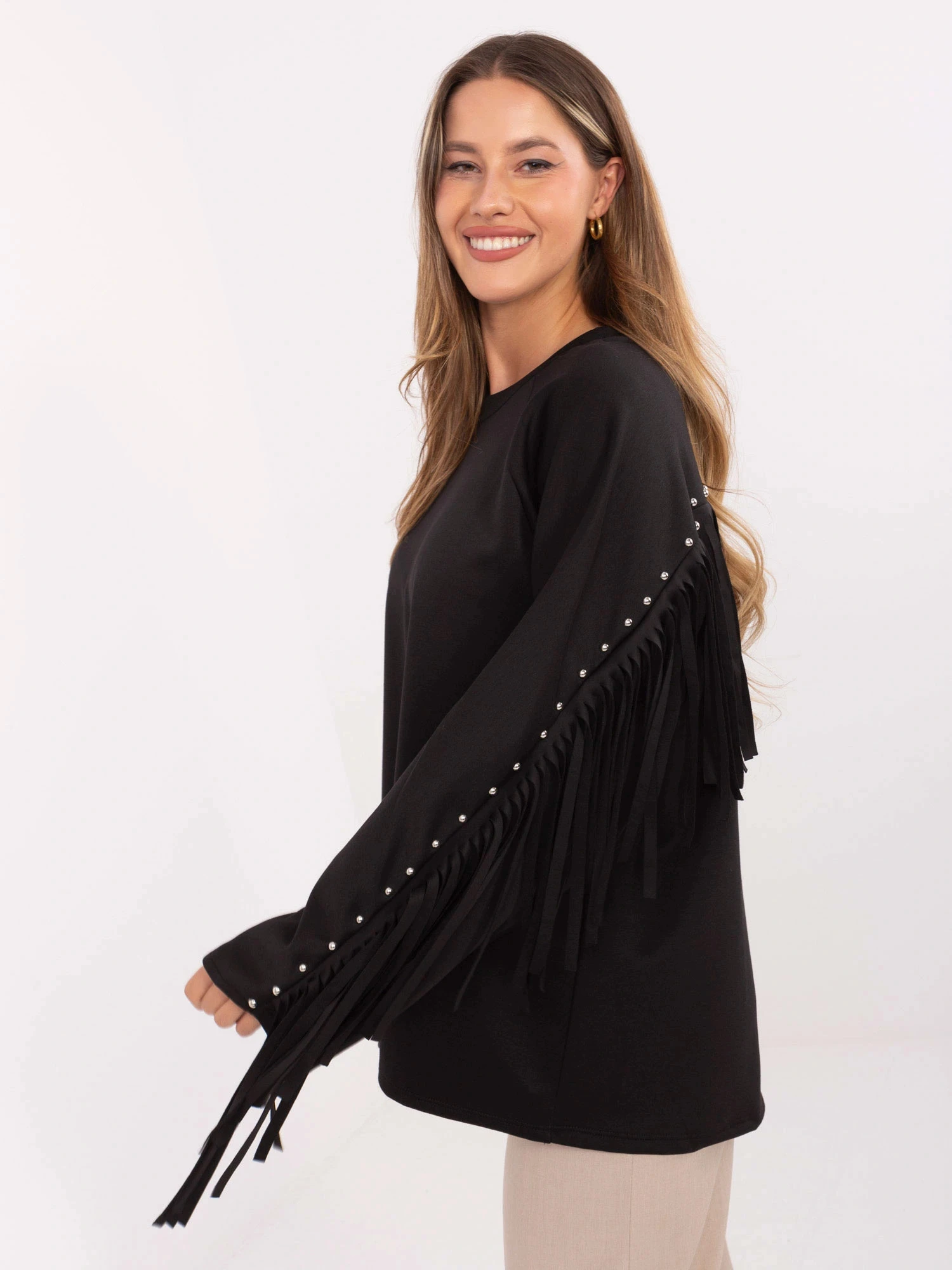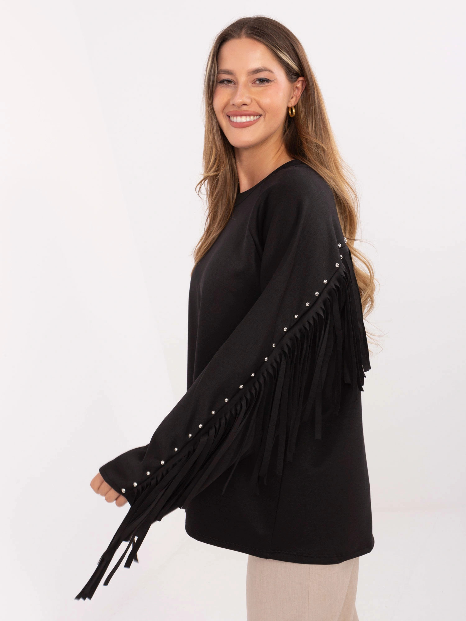 Černá volná dámská mikina s třásněmi model 21818065 - Factory Price