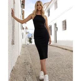 Šaty jsou vyrobené z žebrovaného materiálu a jsou na ramínkách, která se na zádech kříží. Model má délku do poloviny lýtek.