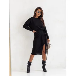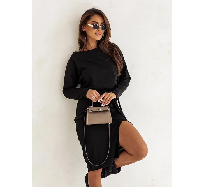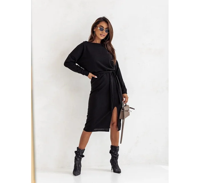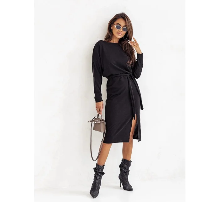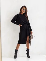 Šaty mají lodičkový výstřih a dlouhé rukávy. Model doplňuje pásek pro zavazování.