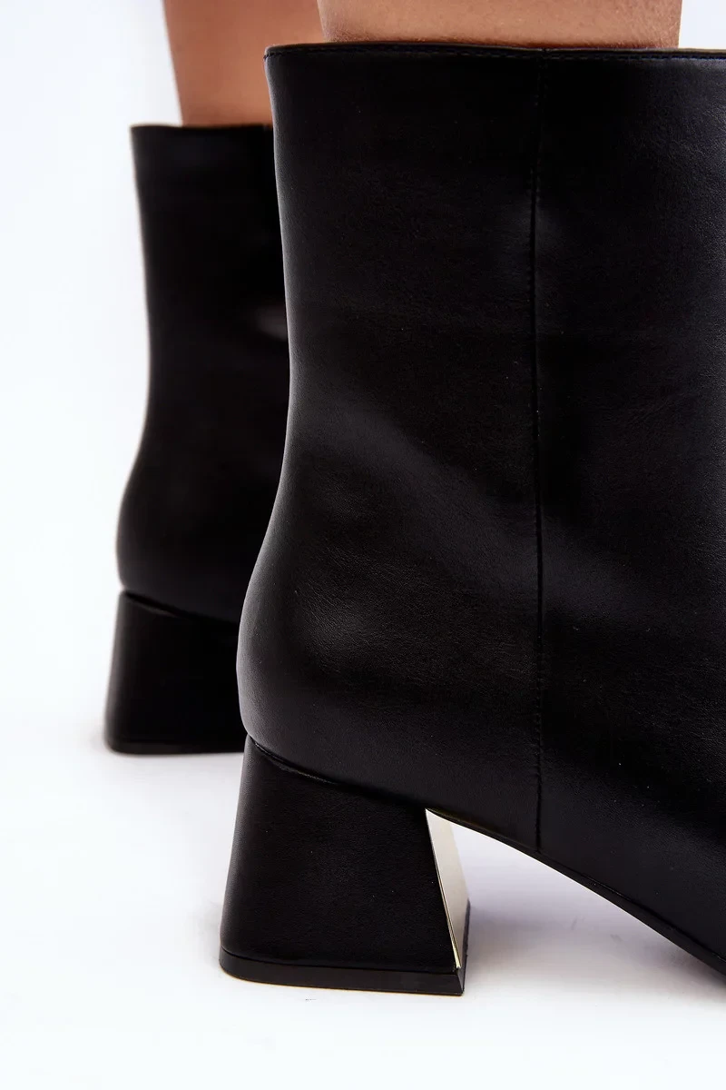 Dámské kotníkové boty vyrobené z eko kůže. Nasazené na nízkém podpatku se zrcadlovým detailem. Zapínání na zip na boku. Plastová dekorace ve zlaté barvě dodává jemné kouzlo. Hranaté prsty. Vyztužený podpatek Musíte je mít ve svém šatníku! Při výběru velikosti se řiďte tabulkou velikostí.