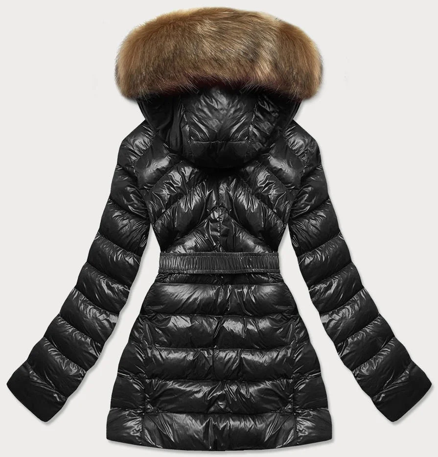 Černo-béžová lesklá zimní bunda s mechovitou kožešinovou podšívkou (w674)