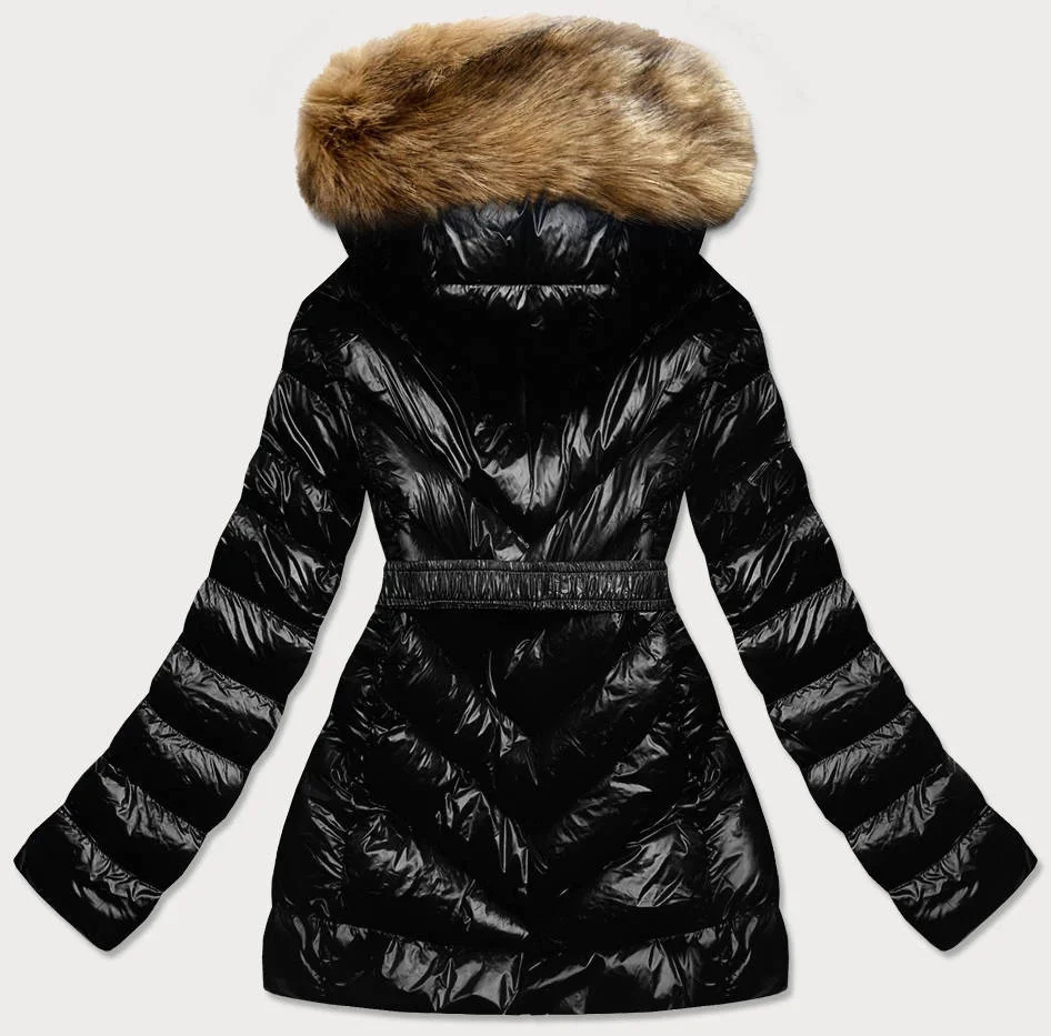 Černo-hnědá lesklá zimní bunda s mechovitou kožešinovou podšívkou (w673)