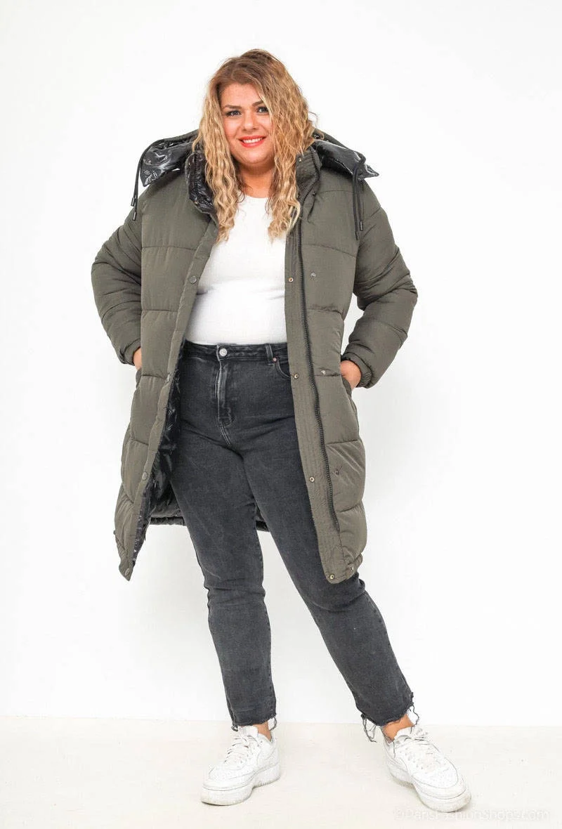 Bunda má jednoduchý střih, je zateplená syntetickou péřovou výplní, má dvě kapsy se zapínáním na patentku nebo zip a zapíná se zipem a panelem s patentkami. Model má kapuci, kterou je možné odepnout. Na koncích rukávů je guma. Bunda má délku nad kolena.