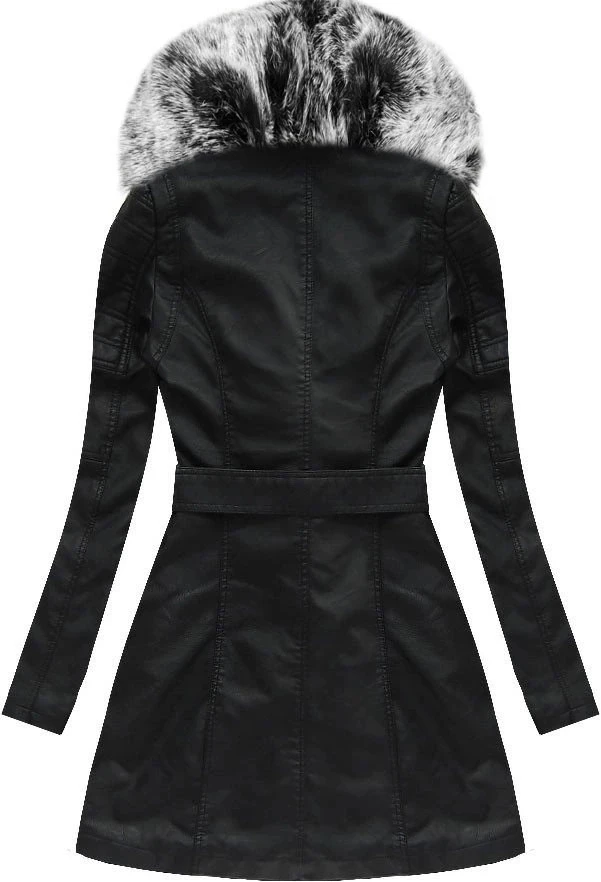 Černo-šedý kabát z ekologické kůže s kožešinovým límcem Libland (LD-5518)
