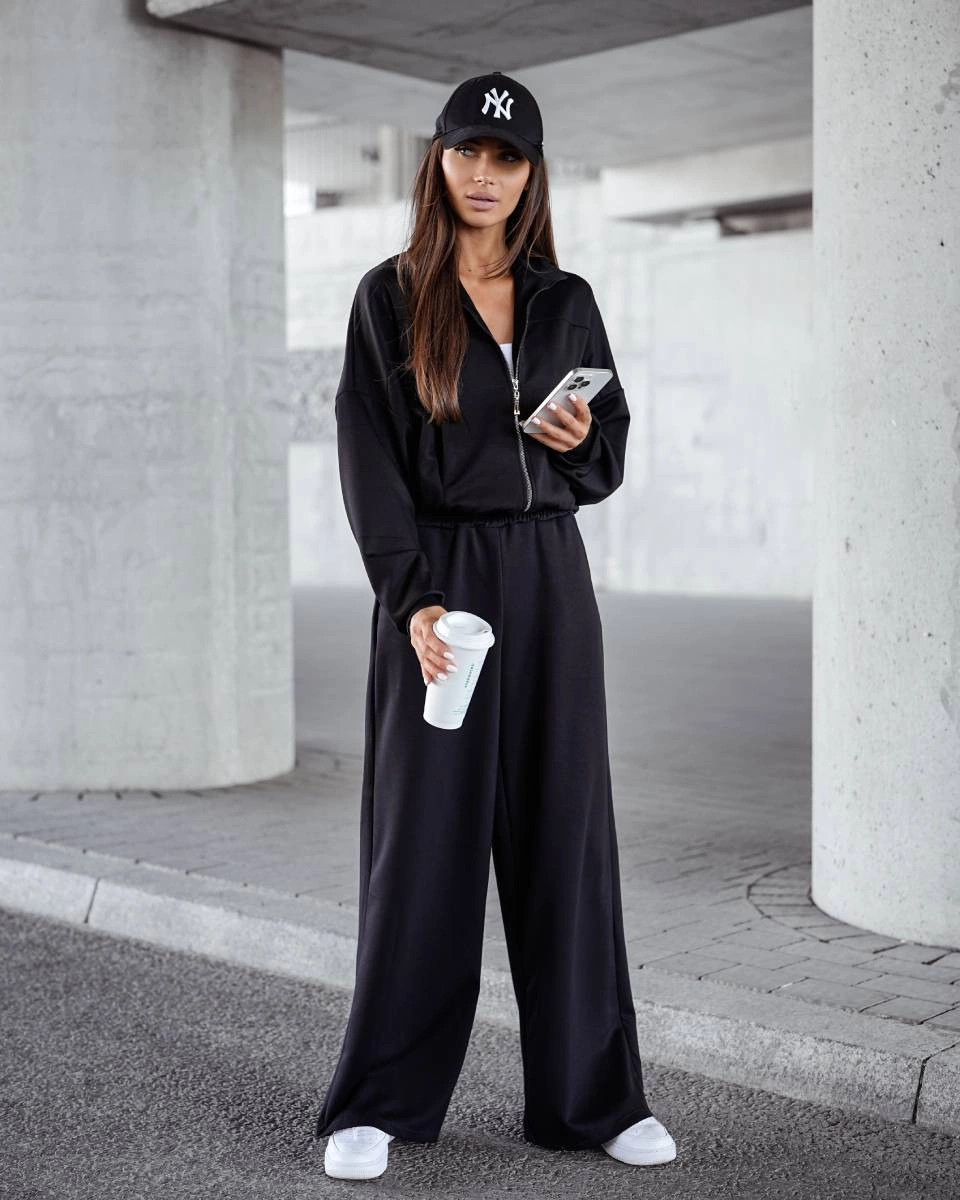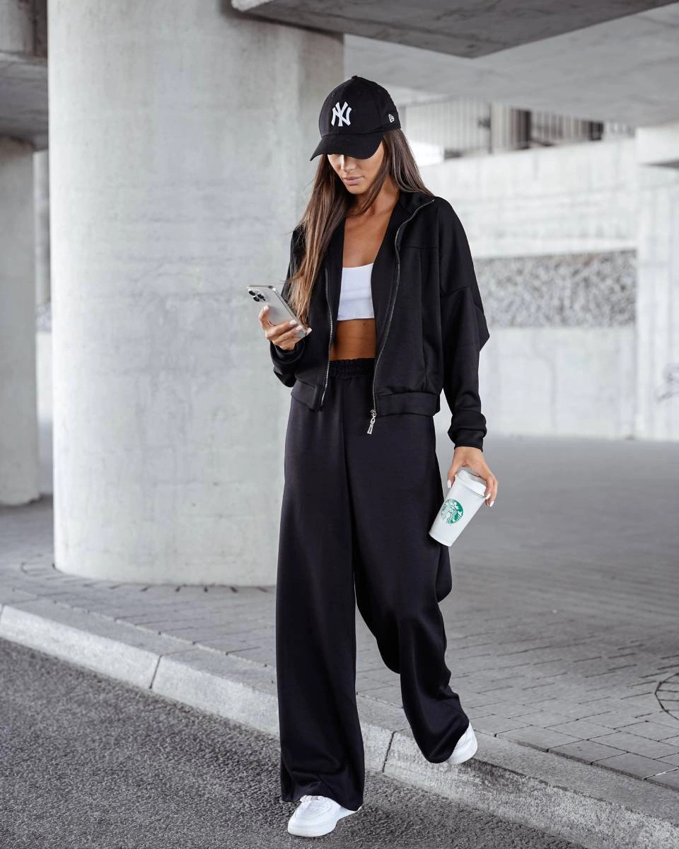 Přidání recenze k Černý dámský komplet - mikina se stojáčkem a široké kalhoty (821109)
