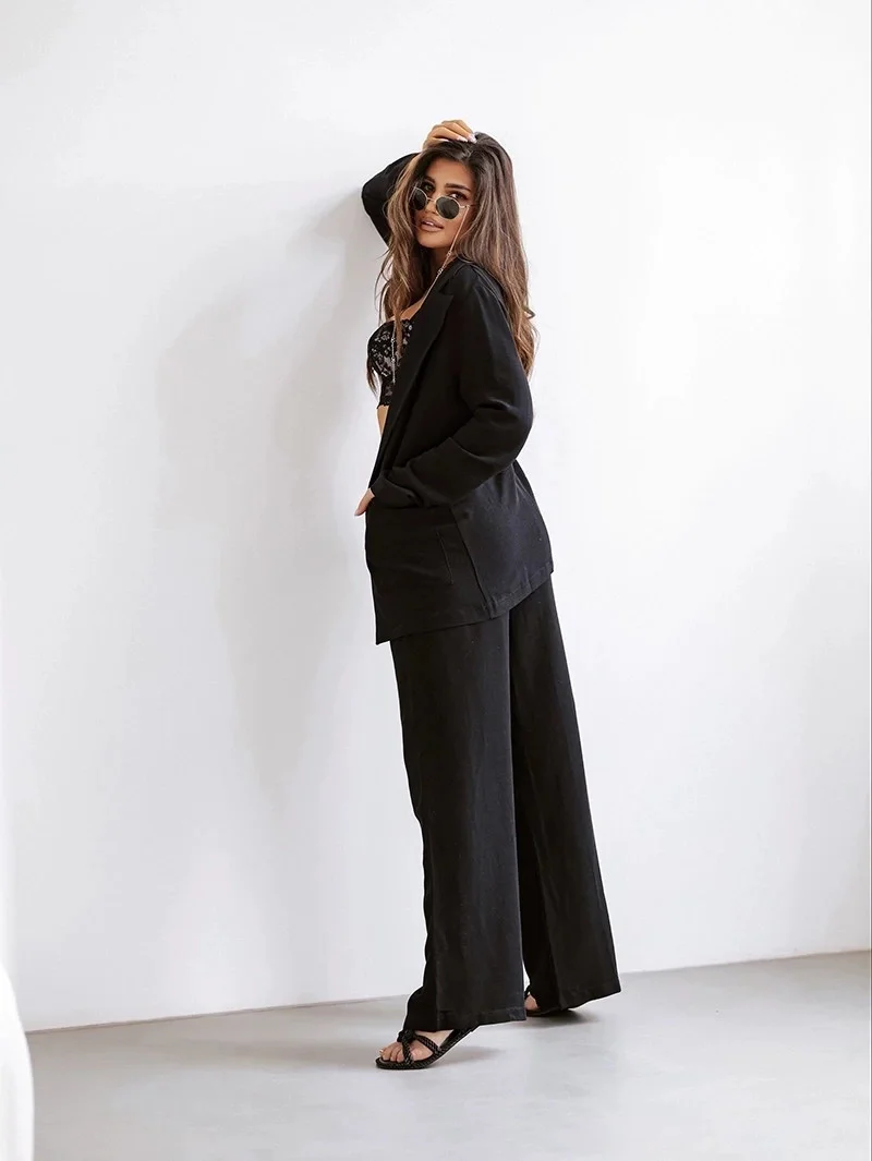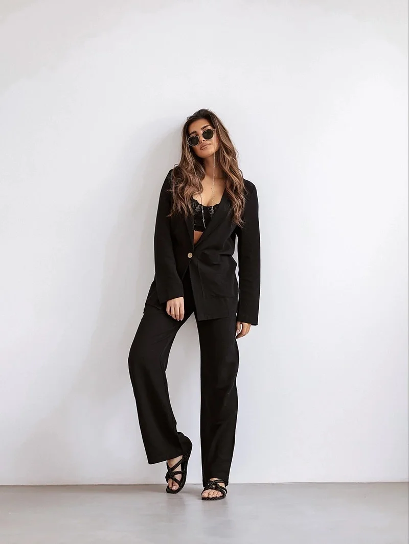 Dámský oblek, který se skládá ze saka a kalhot.