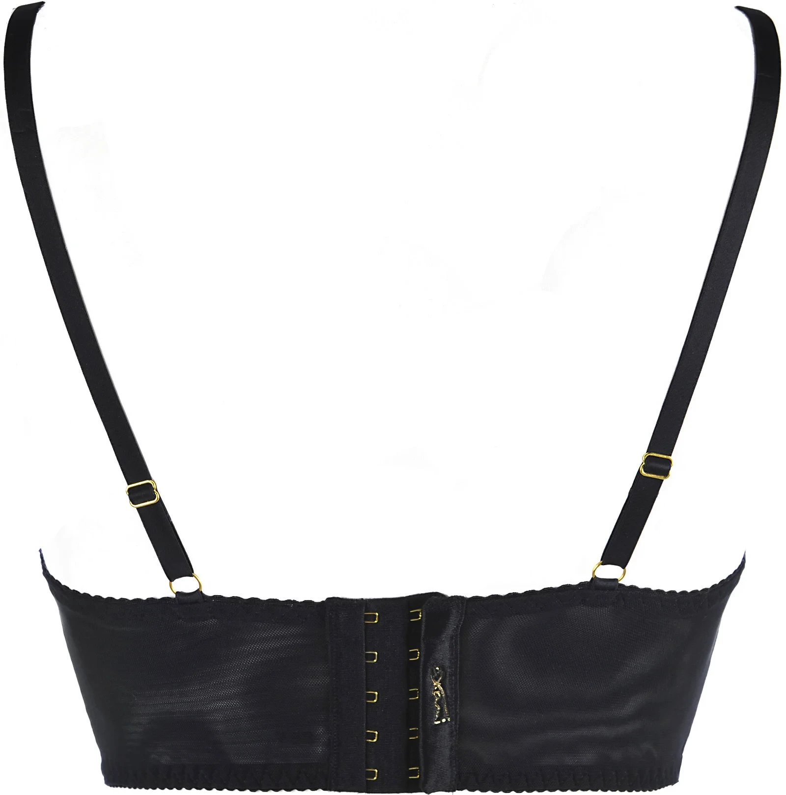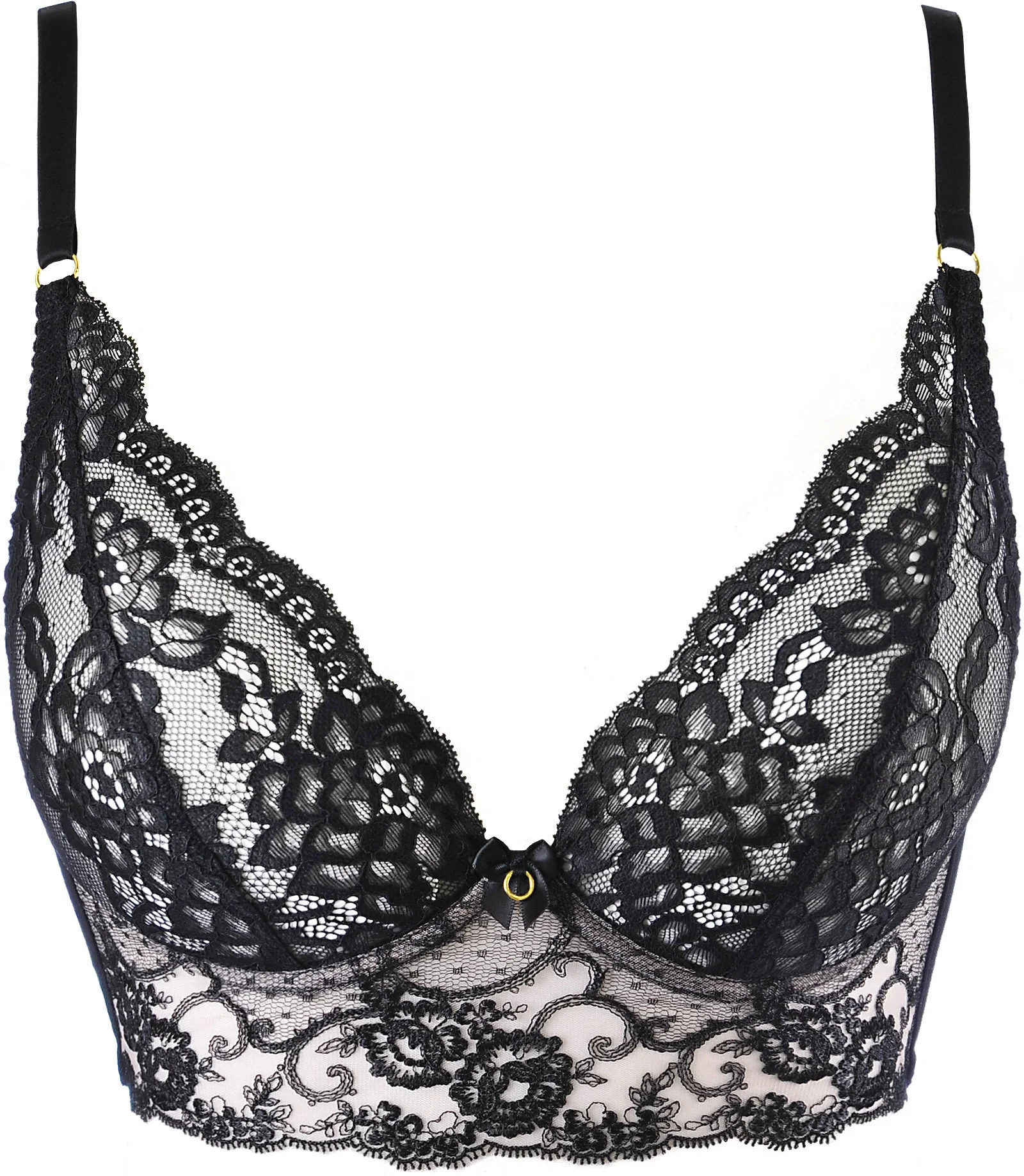 Úžasný, svůdný černý polokorzet upoutá pozornost strukturou materiálu - jemnou krajkou s příjemným povrchem a netradiční výšivkou pod košíčky. Ramínka jsou nastavitelná, ale neodepínací, s pětiřadým zapínáním na háčky a smyčky. Zadní část modelu je vyrobena z pohodlného dvojitého tylu. K doplnění sady doporučujeme tanga V-10515 brazyliana. Má boční kostice, žádné výplně košíčků.