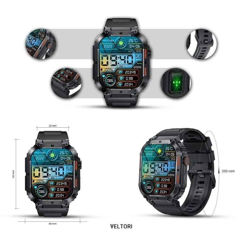 Dzięki sensorowi możesz w każdej chwili zmierzyć lub wykonać pomiar: ciśnienie krwi, tętno lub saturację - zawartość tlenu we krwi w swoim organizmie. Kontroluj wyniki podczas każdej aktywności fizycznej. Niezależnie czy jeździsz na rowerze, biegasz, czy też po prostu jesteś w pracy lub odpoczywasz. Twój smartwatch Veltori stanie się osobistym asystentem dbającym o twoje zdrowie każdego dnia.