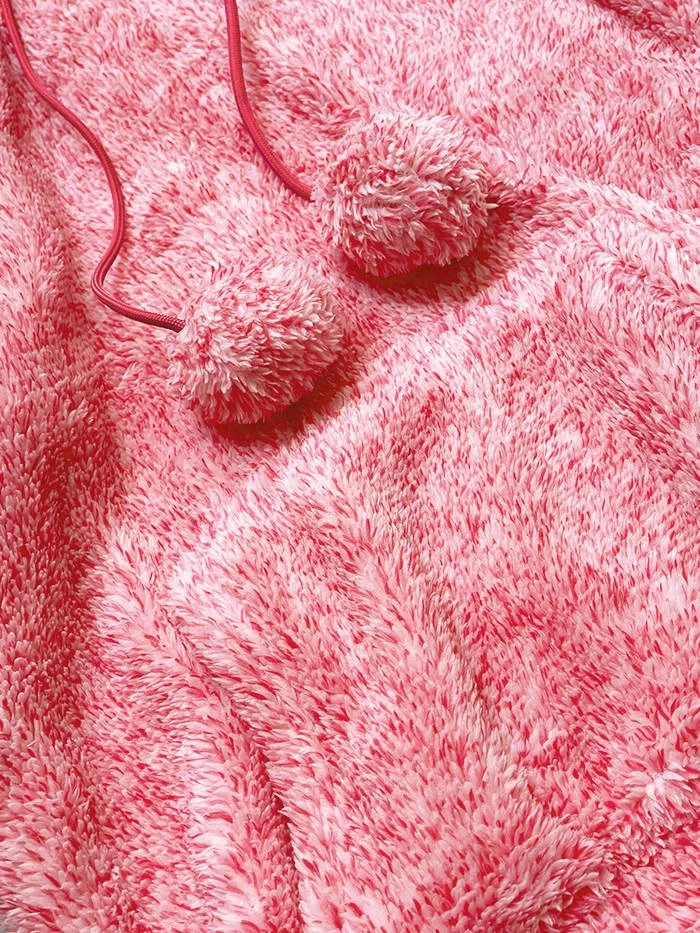 Mikina je vyrobená z měkkého kožešinového materiálu, obléká se přes hlavu a má délku k bokům. Model je lehce pružný a má jednu "klokaní" kapsu. U kapuce jsou stahující šňůrky s bambulemi.
