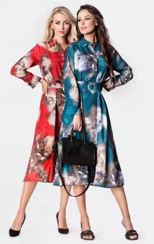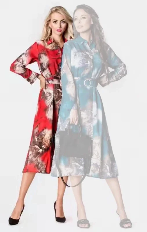 Šaty mají límeček a opasek. Vrchní část šatů se zapíná knoflíčky. Model má dlouhé rukávy s manžetami. Spodní část modelu je rozšířená. Šaty mají délku do poloviny lýtek.