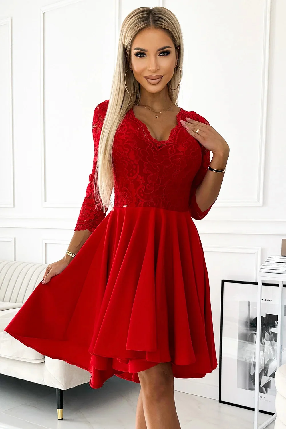 Červené dámské šaty s krajkovým výstřihem a delším zadním dílem model 19147973 - numoco